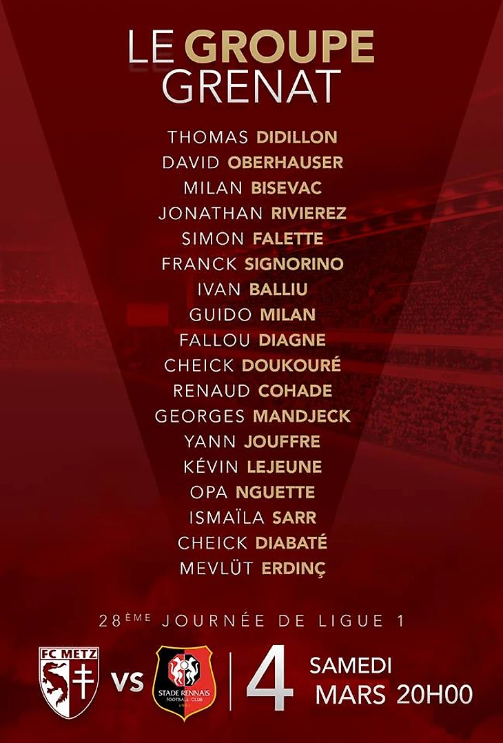 Форвард "Метца" Шейк Диабате включен в заявку на матч 28-го тура Лиги 1 против "Ренна", который состоится завтра в 22:00 по московскому времени. Напомним, что прошлый тур Царь пропускал из-за проблем со здоровьем.