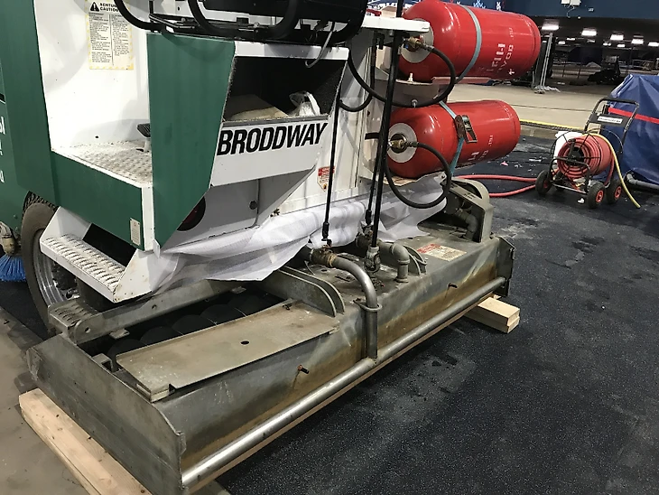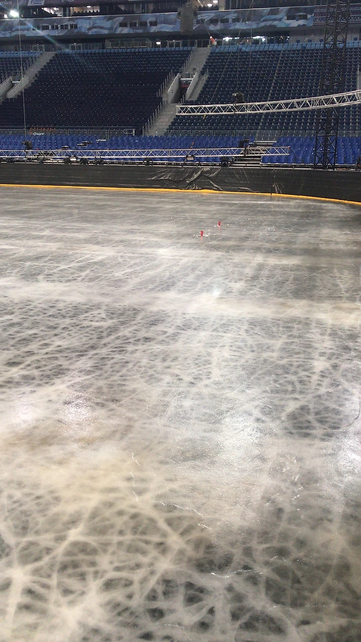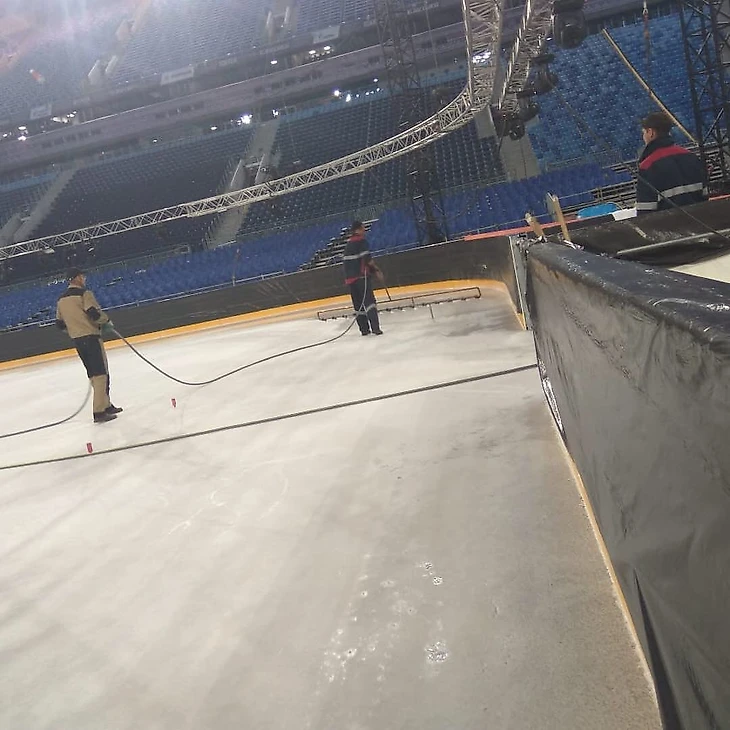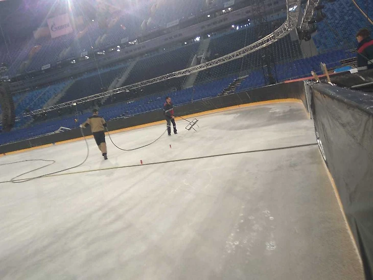 Теперь специально обученные люди начинают распыление краски на наше основание. Зачем спросите? Все просто... для того чтобы лёд был белый и красивый, а не серый.