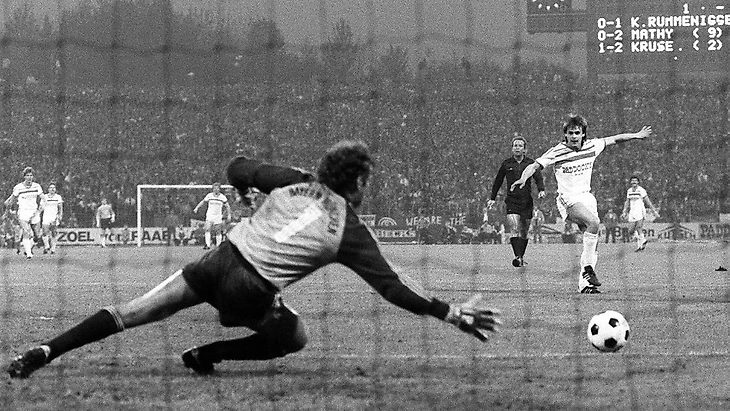 С особым удовольствием вспоминаю, что в этом матче я забил и левой ногой, и правой, и головой. В эпизоде с моим первым голом, когда я сделал счёт 2:2, мяч поднялся в воздух. Клаус Аугенталер подумал, что я ударю. Вместо этого я переложил мяч с левой ноги на правую и пробил точно в левый нижний угол. Жан-Мари Пфафф немного не успел. В ситуации с моим вторым голом Матиас Шиппер, настоящий боец, прошел вперед как фланговый защитник и сделал точный навес. Пфафф не вышел из ворот, так что мне нужно было, высоко выпрыгнув, лишь кивнуть в сторону ворот. Перед тем, как счет стал 6:6, казалось, что мяч целую вечность находится в воздухе после заблокированного штрафного удара, и я левой ногой отправил его в дальний угол. После этого все на меня бросились – к частью, я выжил (смеется).