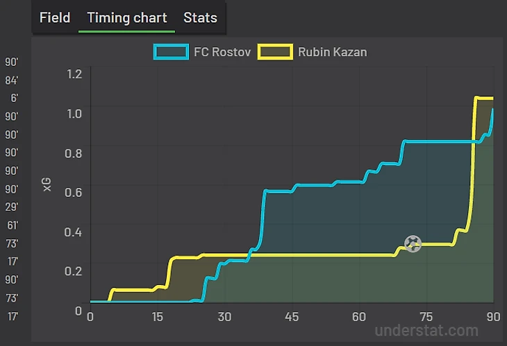Xg в матче против "Рубина". Голубая линия показывает, что "Ростов" весь матч был ближе к голу.