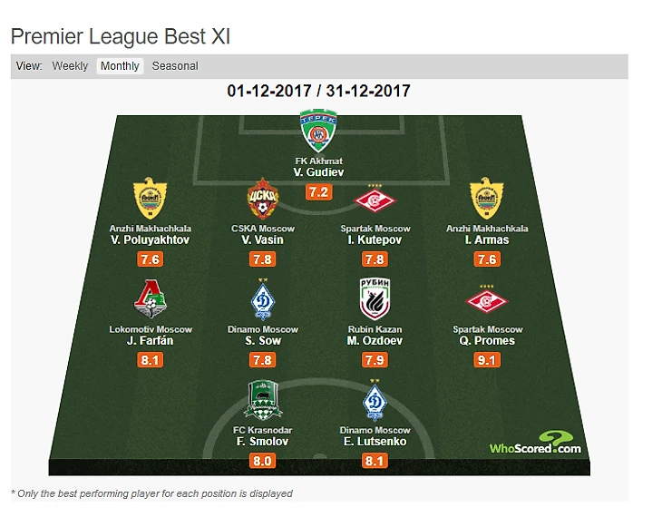 По итогам декабря Самба Соу и Евгений Луценко были включены в сборную месяца по версии портала WhoScored.com.
