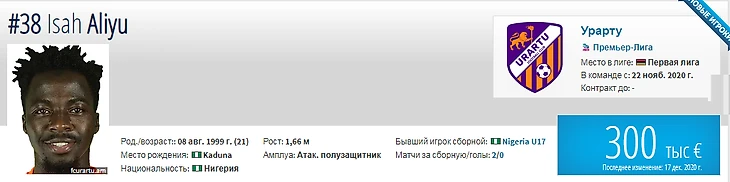 На второе место поставим атакующего полузащитника клуба Урарту. Да, игрок пришёл в клуб только в ноябре 2020 года, но успел уже провести несколько матчей. Он уже был знаком с армянской лигой, так как выступал здесь за клуб Лори. Летом 2019 года Альмерия заплатила за трансфера футболиста из Лори 140.000 евро и плюс 20% от следующего трансфера. А так как Альмерия впоследствии продала игрока за 400.000 евро, то Лори получил ещё 80.000 евро. В сумме более 200 тысяч евро. Из сильных качеств выделим технику, скорость, видение поля и передачи.