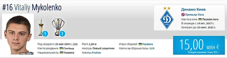 На первое место поставим флангового защитника киевского Динамо. Виталий уже смог провести за основу Динамо 93 матча, и он является одним из важнейших футболистов для клуба. Он вызывает большой интерес у клубов Серии А, его сватают в «Интер», «Милан», «Рому», «Наполи» и «Ювентус». Сейчас сайт transfermarkt оценивает Миколенко в 15.000.000 евро, но его рыночная стоимость значительно выше 20.000.000 евро. Я уже проводил его оценку у себя в блоге и уже тогда он оценивался выше 20.000.000 евро. Из сильных качеств выделим скорость, отбор, неуступчивость и выносливость.