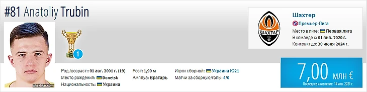 Трубин очень ярко проявил себя в матчах Лиги Чемпионов. Его признали игроком года в Шахтёре, а это очень солидное достижение, учитывая какие футболисты собраны в данном клубе. Главное спортивное медиа Франции L’Equipe также, как и Забарного включило и Трубина в список топ-50 молодых талантов. Анатолий в списке расположился на 30-м месте. Из качеств выделим игру ногами, рефлексы, ловкость, игру на выходах и выбор позиции.