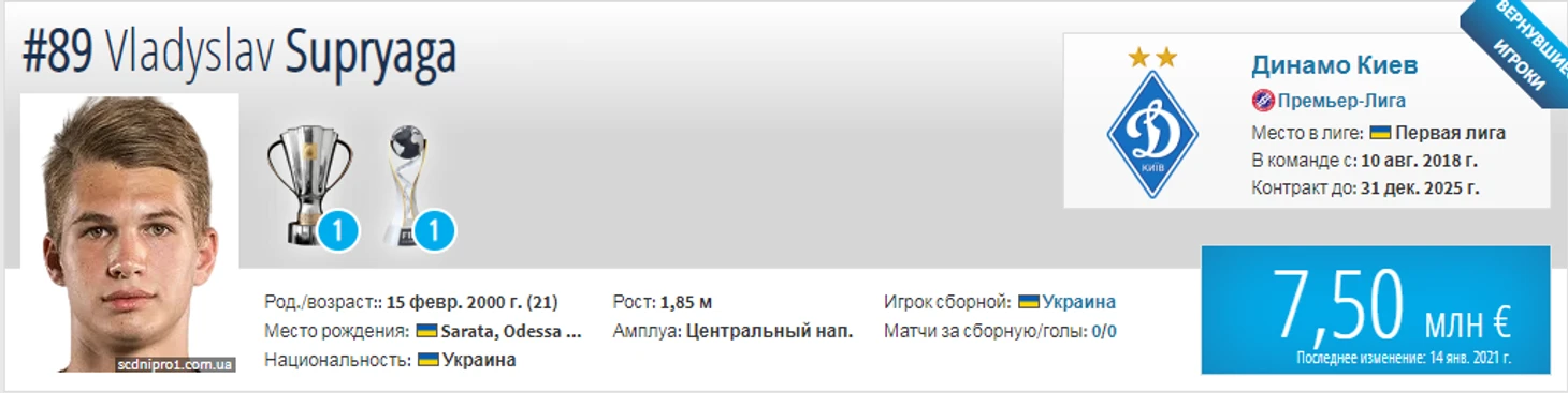 Итальянская Болонья предлагала за Супрягу 10.000.000 евро, но руководство киевского Динамо запросило минимум 15.000.000 и в итоге трансфер сорвался. Футболист он очень талантливый, и думаю у него будет ещё возможность перейти в клуб из топ чемпионата. Супряге удалось очень ярко блеснуть, когда он находясь в аренде сумел сделать хет-трик в ворота клуба, которому тогда принадлежал киевского Динамо. Владислав вызывался в национальную сборную Украины, но пока за неё не дебютировал.