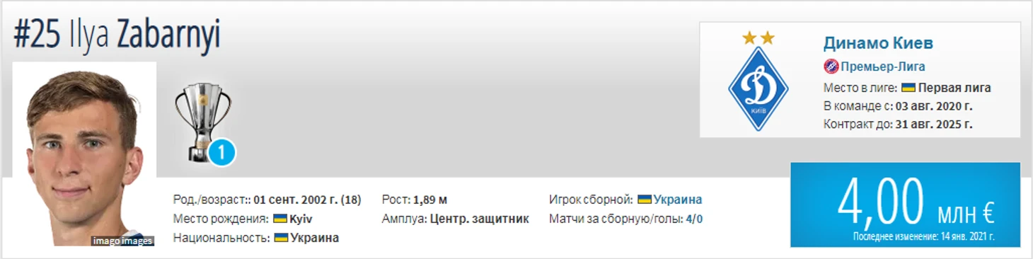 Нашу пятерку открывает центральный защитник киевского Динамо. Илья провёл полностью все матчи квалификации и группового этапа Лиги Чемпионов нынешнего сезона и выглядел в них очень достойно, учитывая, что ему только 18 лет. Главное спортивное медиа Франции L’Equipe включило Илью в список топ-50 самых талантливых молодых футболистов родившихся после 1 января 2002 года. В самом списке он расположился на 23 месте. В октябре 2020 года он дебютировал за главную сборную Украины и уже успел провести за неё 4 матча, при чём все против топовых сборных (Германии 2 раза, Португалии и Испании).