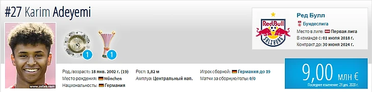 В отличии от прошлых наших участников топа Карим уже является заметным игроком в основе Зальцбурга и успел провести за клуб 31 матч. Сайт transfermarkt оценивает его сейчас в 9.000.000 евро и это 7-е место среди всех футболистов австрийской лиги. Летом 2019 Барселона уже делала по нему предложение в размере 15.000.000 евро, но оно не устроило австрийский клуб. У него длительный контракт с клубом до лета 2024 года, и в Зальцбурге явно постараются его выгодно продать в будущем. Из качеств отметим потрясающую скорость, дриблинг, технику, скорость работы с мячом и командную работу.