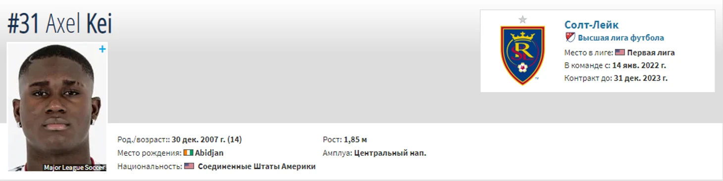 Открывает наш топ-3 футболист клуба Солт-Лейк Аксель Кей. Кей подписал контракт с Реал Солт-Лейк 14 января 2022 года. В возрасте 14 лет и 15 дней Кей стал самым молодым подписчиком контракта в истории MLS, побив рекорд Фредди Аду за восемнадцать лет. Аксель родился в Кот-д'Ивуаре, вырос в Бразилии и переехал в Сан-Диего в 2017 году. У него есть все необходимые качества, чтобы стать очень сильным нападающим и не повторить карьеру Фредди Аду. Пока он выступает за вторую команду клуба Реал Монархс.