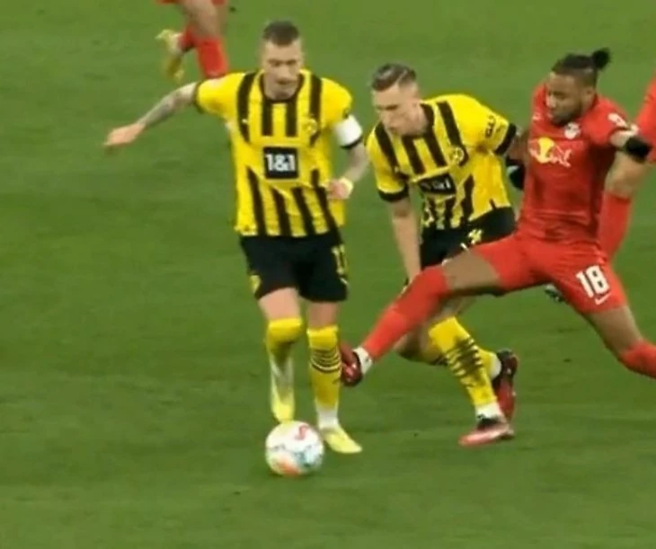 В конце тайма, Лейпциг мог и остаться в меньшенстве, да судья никакого наказания Шлагеру за прямую ногу не дал.