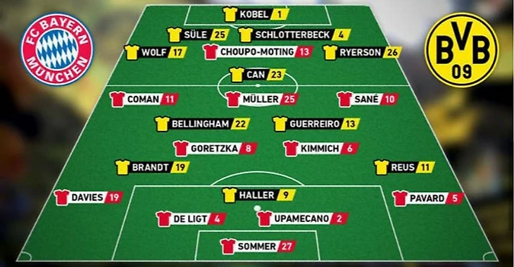 Боруссия Дортмунд приехала на Альянц-Арену в боевом составе. Готовы были выйти и Брандт, Шлоттерберк, Кобель. Всех Терзич поставил в основу. У Баварии же Шуппо-Мотинг вернулся в основу.