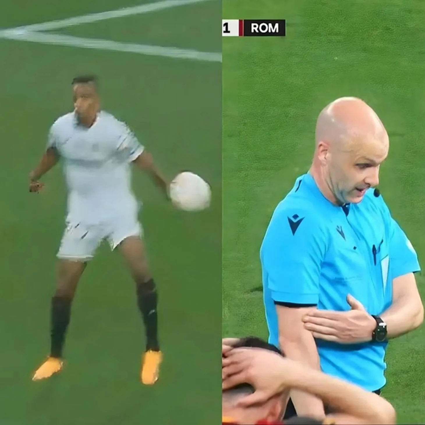 И вот тут, случились интересные моменты. Сначала сбивают игрока Севильи. Тут же, игроки Ромы набегают на судью, который ещё и решение дать не смог, но пенальти не поставил, игрок Ромы считанными миллиметрами задел сначала мяч, а потом ногу игрока Севильи. Рома в долгу не осталась, Матич, при подаче попал в руку Фернандо. С одного ракурса видно было, что руку успел убрать Фернандо, а на другом, так не кажется.