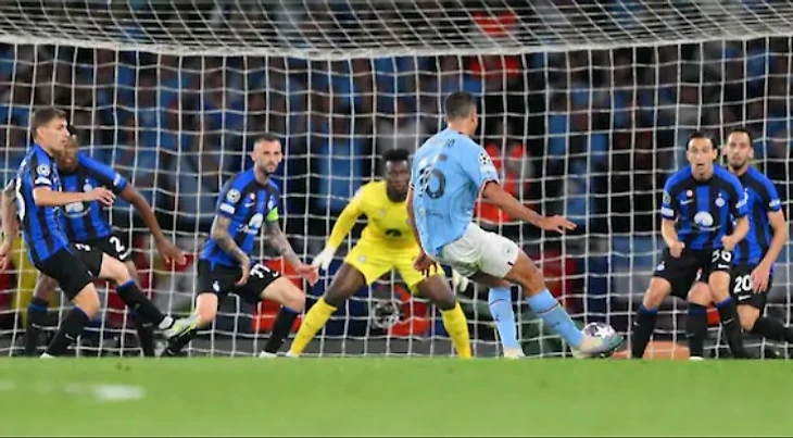 Ближе к середине тайма, Интер начал уставать, а Ман Сити начал поддавливать. Тут и впервые за час, горожане подавали угловой. А на 67 минуте, Аканджи обманул Интер, замахнулся для удара, но отдал пас, рикошет от игрока Интера, и мяч катится из штрафной, но не даёт выйти ему Родри, он набегает на мяч и мощным ударом открывает счёт 0-1.