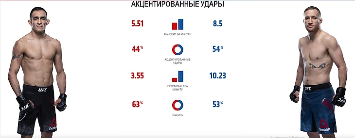 Рост бойцов – одинаковый: 180 см. Но в размахе рук у Тони огромное преимущество (15 сантиметров). Большая разница в размахе рук сыграет ключевую роль в этом поединке. Джастину комфортно драться только на средней дистанции: он сближается и бьет короткими крюками (в идеале из клинча). Фергюсону не составит труда держать его на дистанции при помощи длины рук и его любимого мидл-кика. А если Джастин сблизиться слишком близко, то рискует оказаться в партере, что именно для Гейджи – гораздо опаснее.