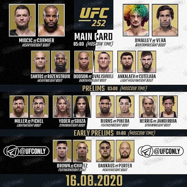 Утром 16 августа пройдёт UFC 252, где нас ждет мега главный кард: Стипе Миочич против Даниэля Кормье, а в со-главном поединке Шон О`Мелли подерется против Марлона Веры.