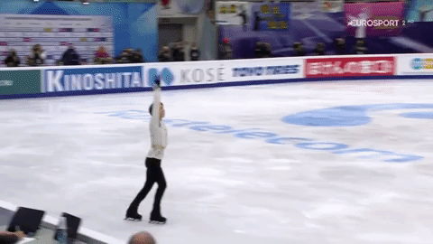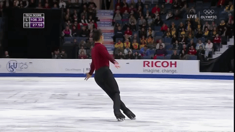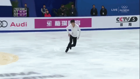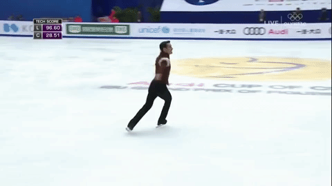 Произвольная программа Натана Ченаhttps://youtu.be/ym4pTIg-fyo начинается с позировки и простой коньковой связки: беговой, моухок, тройка, четыре подсечки перед заходом на первый элемент программы - каскад 4Lz+3T. После каскада беговой, моухок, подсечка и комбинированная связка для судей (гиф 1): кораблик, пара беговых, широкий шаг, шассе, чоктау. Далее три беговых и простые шаги перед заходом на 4F (с риттбергерной тройки). После выезда с прыжка - позировка, тройка, связка из простых шагов и серии подсечек, 4S с риттбергерной тройки. После прыжка - две тройки со сменой ноги между ними и либела со сменой ноги, после которой сразу же начинается дорожка шагов (42 с). После дорожки - провозка на двух ногах с переходом в кораблик, подсечка, переход на ход вперед, тройка, подсечка, провозка на двух ногах (гиф 2). Далее четыре подсечки и подготовка к каскаду 4Т+2Т+2Lo (исполнен с тройки). После каскада фигурист сделал три беговых, перешел на ход назад, подставил вторую ногу и попытался исполнить второй 4Т (с тройки) *подготовка к обоим тулупам (в каскаде и сольному) как под копирку*. Далее пара переходов на ход вперед с тройкой между ними, беговой, джаксон, четыре подсечки, переход через моухок в кораблик и 3А. После прыжка коньковая связка из простых шагов, две подсечки перед подготовкой к каскаду 3А+2Т, после которого - пара беговых, моухок, подсечка и 3Lz. После прыжка - пара беговых и хореографическая секвенция (19 с) и два комбинированных вращения в финале программы.