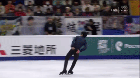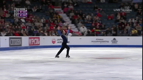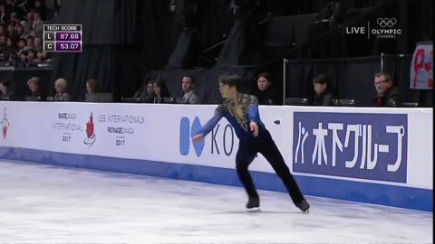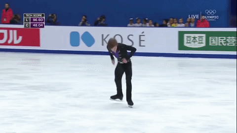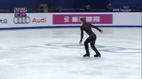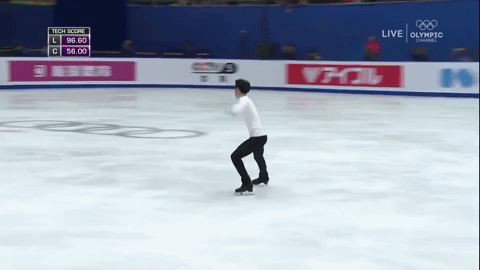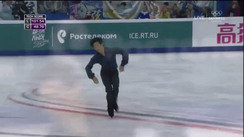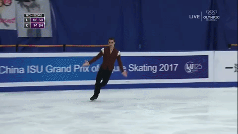 Патрик Чан начинает произвольную программу https://www.youtube.com/watch?v=JONk9aO-TaM&t=1s с трех беговых, крюка и смены ноги с переходом на ход вперед. Серия простых шагов, два беговых, широкий шаг и заход на 4Т (обманный шаг-тройка). После выезда с прыжка - переход на ход вперед, пара беговых, связка из двух джаксонов и пара подсечек перед заходом на 3Lz. Подпрыжка на выезде с лутца, коньковая связка из простых шагов перед подготовкой к ойлерному каскаду с акселем. Сразу после каскада Патрик переходит к хореографической секвенции (32 с), после которой несколько беговых с шассе между ними и заход на второй тулуп (обманный-тройка). После прыжка - остановка с позировкой, зубцовый шаг, тройка и красивая коньковая связка (гиф 1): переступания на ход назад, широкий шаг, крюк, джаксон, кросс ролл, две тройки с выносом свободной ноги. Далее переход на ход вперед, коньковая связка перед сольным акселем. Провозка на двух ногах, подсечка, пара моухоков, подсечка, чоктау с переходом в дугу на ход вперед и без подготовки 2Lo. После прыжка - переход на ход вперед, две тройки и фирменный заход Патрика через твизл на вращение в либеле со сменой ноги. Позировка на выходе из вращения и комбинированная связка (гиф 2): подпрыжка, моухок, широкий шаг, моухок, шассе, моухок. Пара беговых, серия моухоков и шассе перед 3Lz. После выезда с прыжка две подсечки, подпрыжка, переход на дугу вперед-наружу, риттбергерная тройка и 3F. После прыжка фигурист без подготовки переходит к вращению в волчке. Пара беговых на выходе из вращения, дорожка шагов и финальное комбинированное вращение.
