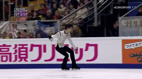 Юзуру Ханю начинает произвольную программу https://youtu.be/PPNqObR85FM с коньковой связки: циркуль на левой ноге, скрещенный шаг, дуга вперед-наружу, переход на левую ногу, тройка, широкий шаг, шассе, подсечка с переход на ход вперед, вальсовая тройка, шассе. Две подсечки перед заходом на первый элемент программы - 4Lz: моухок-широкий шаг-шассе-моухок-подсечка. После прыжка и перехода на ход вперед со сменой ноги - комбинированная связка: провозка по дуге с акцентированными движениями торса, головы и рук, две тройки, бести на внутренних ребрах с переходом в кораблик на наружных ребрах, выкрюк, тройка (гиф 1). Подсечка, моухок, широкий шаг, моухок, подсечка, шассе, дуга с выносом свободной ноги, перетяжка, шассе. Далее начинается заход на 4Lo: моухок-широкий шаг-моухок-шассе-моухок-скрещенный шаг-моухок (прыжок исполнен с серии моухоков). Переход на ход вперед со сменой ноги, провозка на правой ноге в полуприсяде, широкий шаг, перетяжка, тройка. Далее две подсечки перед заходом на 3F: моухок-тройка-переход на ход вперед-тройка-тройка-тройка. На дуге выезда с прыжка - перетяжка-выкрюк-тройка, затем переход на ход вперед и комбинированное вращение со сменой ноги. На выходе из вращения тройка с переходом в бауэр на внутренних ребрах и выпад с харАктерным жестом Сеймея перед началом дорожки шагов (40 с).