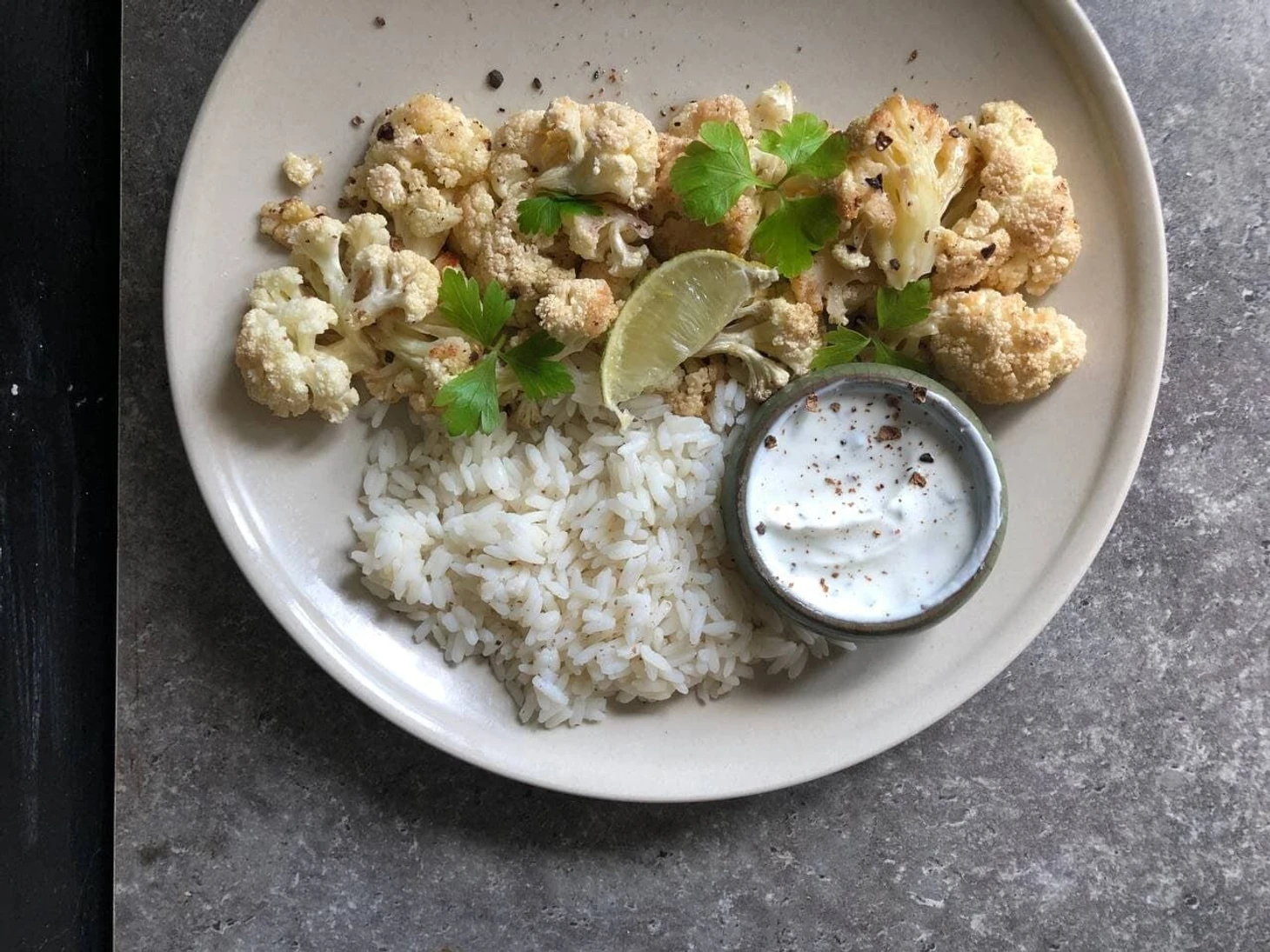 Запеченная цветная капуста, вареный рис и йогуртовый соус