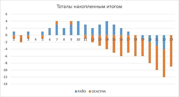 По графику видно, что Райо набрал много очков на ТБ и серия из 7 матчей на ТМ опустила его в отрицательные значения. Т.е. на лицо видно что серия не случайна и должна выровнять команду.