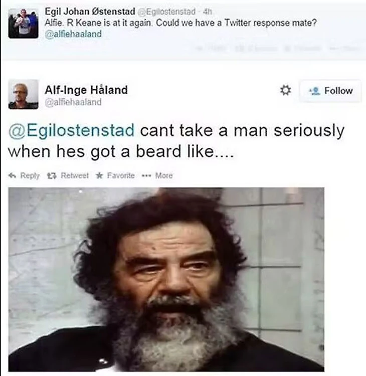 Партнер Альфи по сборной Норвегии Эгиль Эстенстад в твиттере попросил Холанда прокомментировать слова Кина. Тот ответил фотографией Саддама Хусейна со словами: «Не могу всерьез воспринимать слова человека, у которого борода, как у…»