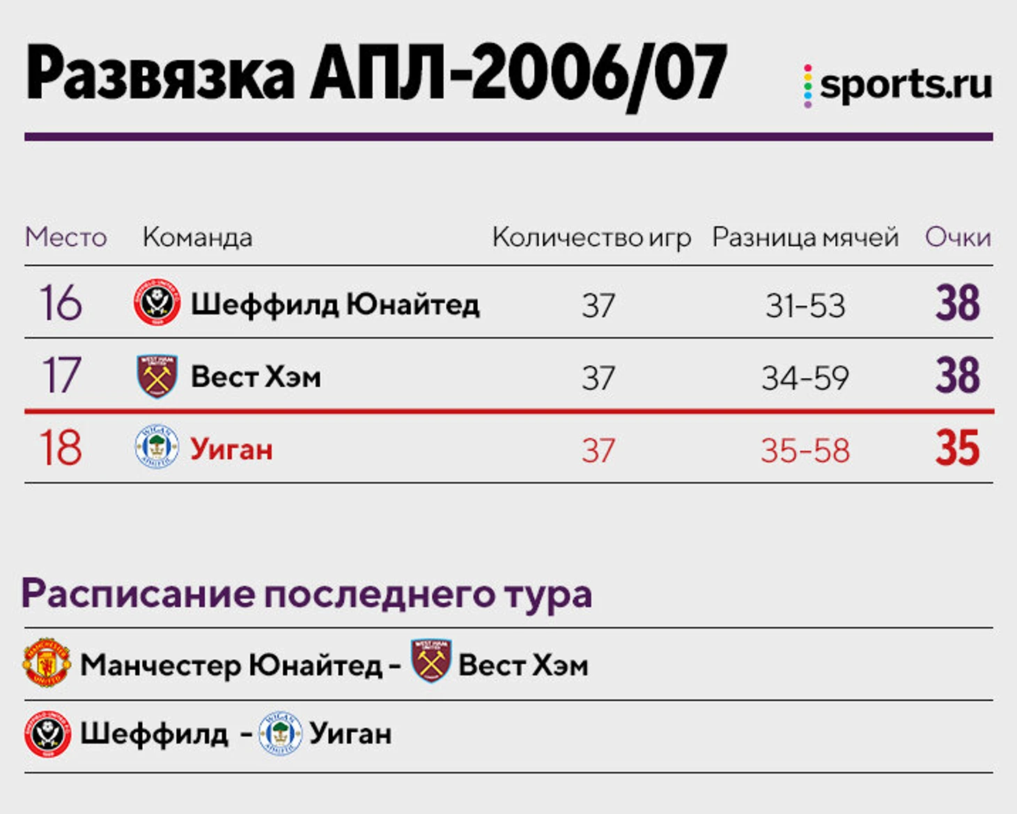 «Уиган» и «Шеффилд» дрались в очном матче, а «Вест Хэм» поехал на «Олд Траффорд». В случае побед «Уигана» и «МЮ», у трех претендентов на вылет было бы по 38 очков, и все решила бы разница мячей. «Латикс» справились, а «Вест Хэм» неожиданно прибил «МЮ» – единственный гол забил Тевес.