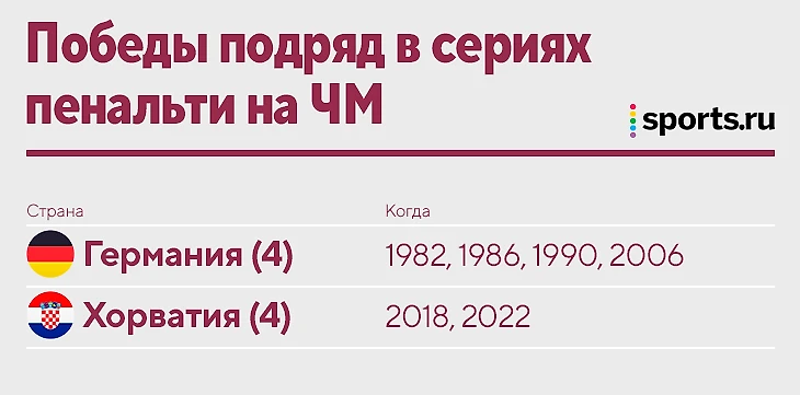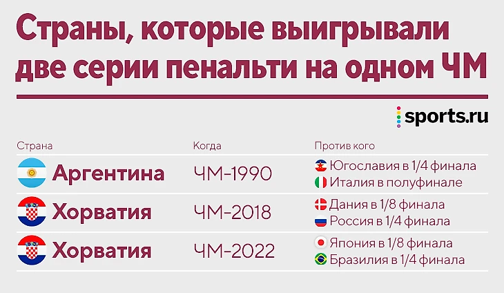 У Хорватии есть еще одно уникальное достижение: никто не выигрывал по две серии пенальти на двух ЧМ подряд. Одна удалась Аргентине в 1990-м. Еще четыре сборные участвовали в двух сериях на одном ЧМ, но выиграли по разу (Испания в 2002-м, Коста-Рика и Нидерланды в 2014-м, Россия в 2018-м).