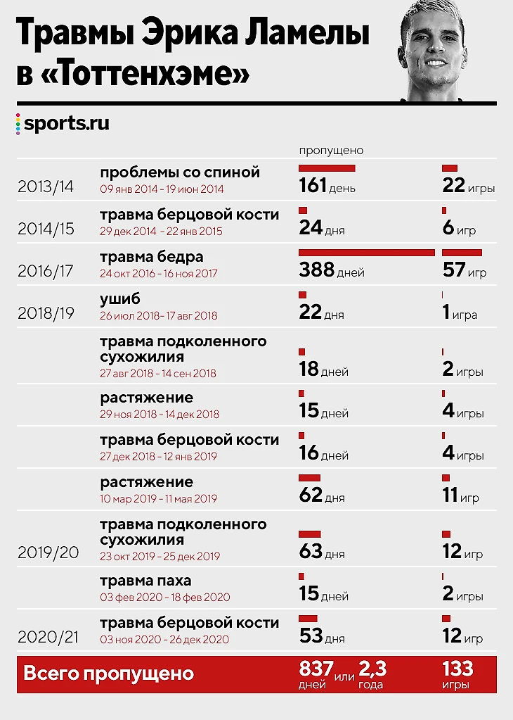 Травмы логично отразились на игровом времени: Почеттино и Жозе Моуринью любили Ламелу, но предпочитали тех, кто здоров и в лучшей форме. После возвращения из ментальной бездны Эрик не засверкал в «Тоттенхэме»: 7, 9, 12, 5 – это его выходы в старте на матчи АПЛ в следующих четырех сезонах.