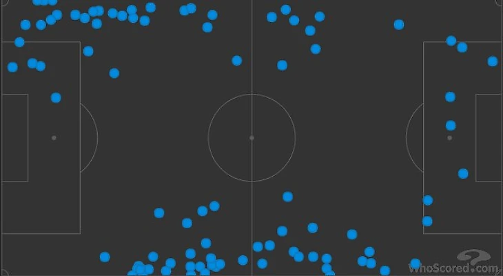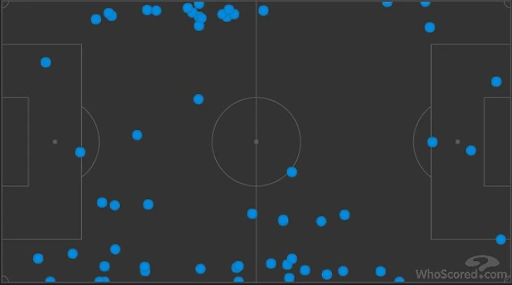 Карта касаний мяча Анюкова и Кришито после 60-й минуты.