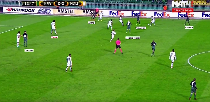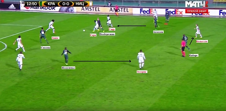 После нескольких отскоков мяч отходит к Сери, на плечах которого висит Подберезкин. Данте может просто выбить мяч в район центрального круга, но это не совсем вписывается в игровой стиль «Ниццы». Все адресаты для короткой передачи перекрыты: Подберезкин по инерции продолжает движение вперед и может перехватить пас на Сарра, к нему же направляется Ахмедов, Каборе и Жоаозиньо готовы сместится вправо для отбора мяча у Козьелло и Эссерика соответственно. Эпизод заканчивается новыми отскоками из-за нежелания игроков «Ниццы» сделать длинную передачу, и мяч оказывается у Каборе.