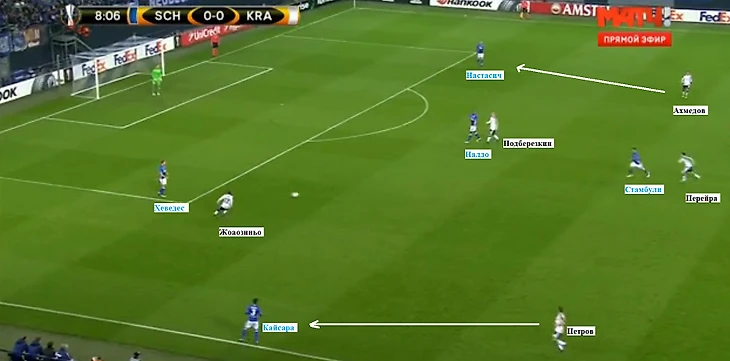 При Шалимове «Краснодар» не использует прессинг до вратаря. Атака соперника начинается сразу, как только мяч получает один из центральных защитников соперника. Если в матче с «Ниццей» они показали свой максимум на данный момент по части контрпрессинга и количеству отборов на чужой половине поля, то один из лучших в плане прессинга, приведшего к потерям мяча соперником, стал гостевой матч с «Шальке».