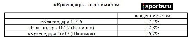 Очевидно, что выборка по Кононову (6 матчей, без учета квалификационных игр Лиги Европы) и Шалимову (11 матчей, с учетом игр группового этапа ЛЕ) несколько различается, но определенные выводы сделать можно. «Краснодар» не стал чаще отдавать соперникам мяч, все так же предпочитая действовать первым номером.