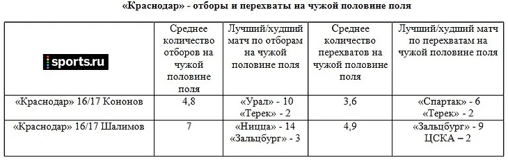 Важно, что каждый игрок атакующей и средней линии «быков» способен выполнять задания главного тренера, у «Краснодара» нет явного лидера по числу отборов и перехватов в непосредственной близости от штрафной соперника. Шарль Каборе несколько превосходит своих партнеров по обоим показателям, но его преимущественно не носит подавляющий характер. Отбирать и перехватывать мячи в «Краснодаре» способны и Измайлов (лучший по отборам на чужой половине поля в игре с «Анжи»), и Лаборде («Оренбург», «Ницца»), и Газинский («Арсенал»), и Окриашвили («Ростов»).