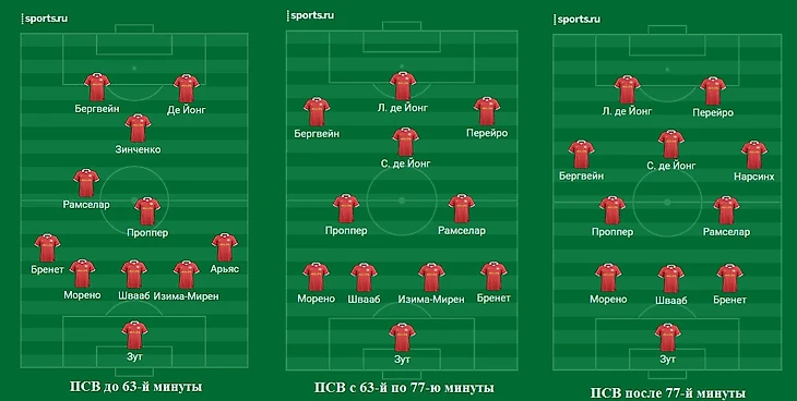 На 77-й минуте Коку решился на последнюю замену. Вместо центрального защитника Изима-Мирена вышел крайний полузащитник Нарсинх, ПСВ вернулся к схеме с тремя центральными защитниками (место замененного француза занял Бренет), но это были именно 3-5-2, а не 5-3-2. Нарсинх и Бергвейн почти все время проводили у штрафной «Ростова», Сим де Йонг не только ждал подбора после выноса мяча защитниками гостей, но и сам выступал адресатом подач с флангов.