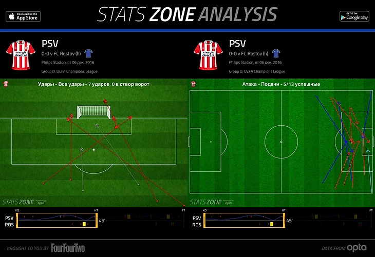Во многом благодаря появившимся по ходу второго тайма футболистам ПСВ удалось перевести игру в штрафную Джанаева. Сим де Йонг успел стать самым бьющим игроком матча (3 удара, 1 в створ), Перейро – самым точным (2 удара в створ из 2 попыток), Нарсинх – вторым после Бренета по обводкам (2 удачных из 4). За последние 20 минут встречи игроки хозяев пять раз пробивали по воротам Джанаева из пределов штрафной, и лишь один из них был заблокирован ростовчанами – остальные пришлись в створ ворот гостей. Показательно и количество касаний Люка де Йонга в штрафной «Ростова» – 2 в первом тайме против 8 – после перерыва.