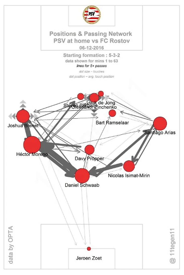 Хозяева однообразно строили свои атаки, после 15-й минуты практически не задействуя центр поля. Проппер располагался слишком близко к тройке игроков обороны, Зинченко, наоборот, больше помогал Люку де Йонгу. Рамселар отметился лишь двумя дальними ударами, не сильно участвуя в подготовительной фазе атаки. В результате, акцент на фланги (в целом верный при схеме 5-3-2 у соперника) стал слишком явным, плана Б у ПСВ до середины второго тайма не было.