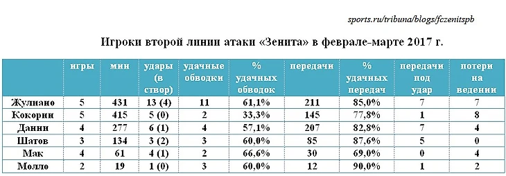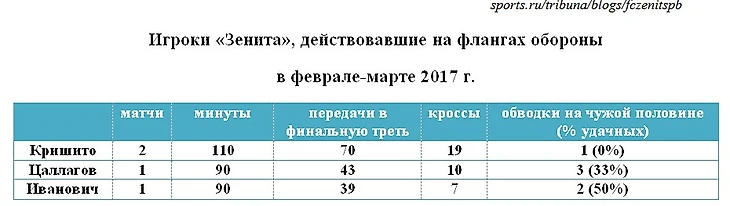 Кришито появлялся слева дважды – в последние 20 минут матча с «Амкаром» и во встрече с «Арсеналом». Цаллагов заменял Анюкова в игре с туляками, а Иванович дебютировал за «Зенит» в гостевом матче против «Андерлехта». Все трое были гораздо более убедительны в атаке (но это необязательно автоматически означало пользу для питерцев), чем Жирков и Анюков. При этом в пяти встречах весны зенитовцы владели мячом примерно одинаковое количество времени (в среднем – около 65%), поэтому сравнения уместны.