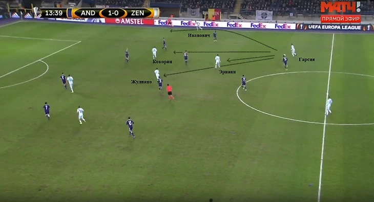 У Гарсии есть четыре адресата для передачи вперед – Иванович, Эрнани, Жулиано и Кокорин. Минимум два (Эрнани и Иванович) могут принять мяч без сопротивления со стороны игроков «Андерлехта». Однако испанец медлит с принятием решения, его начинает прессинговать нападающий бельгийцев, в результате Гарсия разворачивается и отдает пас назад Нету.