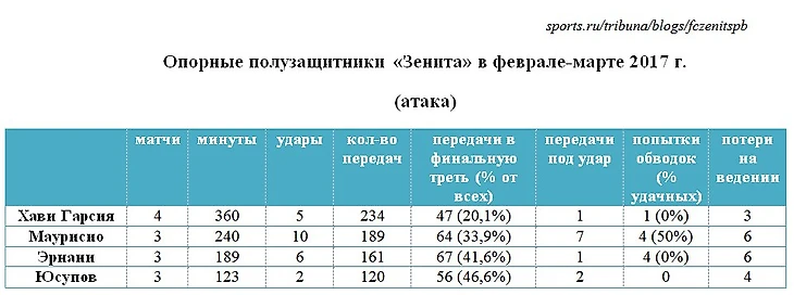 Гарсия катастрофически мало даже для чистого опорника отдает передач в атакующую треть поля. С другой стороны, у испанца меньше, чем у конкурентов, потерь мяча на ведении, но это связано исключительно с излишней перестраховкой Гарсии. Хави не рискует даже в тех моментах, где риск минимален, а «Зенит» имеет хорошую позиционную структуру.
