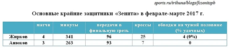 Сами по себе показатели Жиркова и Анюкова мало о чем говорят, но в сравнении с цифрами футболистов, которым этой весной уже доводилось выходить на флангах обороны, они выглядят не лучшим образом.