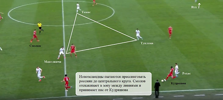 В матче-открытии Кубка конфедераций против России представители Океании удивили – центральные хавбеки встречали оппонентов слишком высоко, во многих моментах неоправданно выбрасываясь вперед. Из-за этого команда Черчесова, испытывающая большие проблемы с выходом из обороны через короткий пас, все же получала возможности для продвижения мяча вперед низом. Чаще других между обороной и средней линией новозеландцев оказывался Смолов – в первом тайме Федор в подобной ситуации отметился неточным пасом на Полоза, а во втором начал (и чуть позже завершил) вторую результативную атаку россиян.