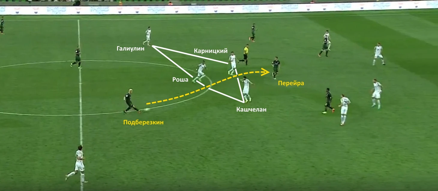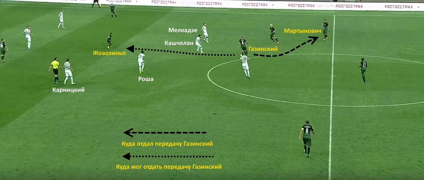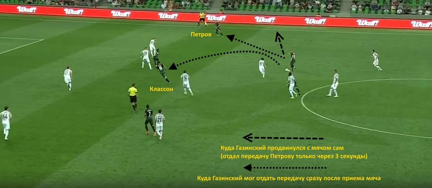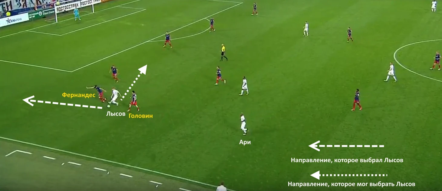 Конечно, свою роль играла и слабая помощь от партнеров (в приведенном примере центрфорвард Ари вообще находится в середине поля), но решения Лысова уходить к лицевой носили перманентный характер. Михаил ничего не испортил, но и креатива (в отличие от Фарфана) от него почти не было.