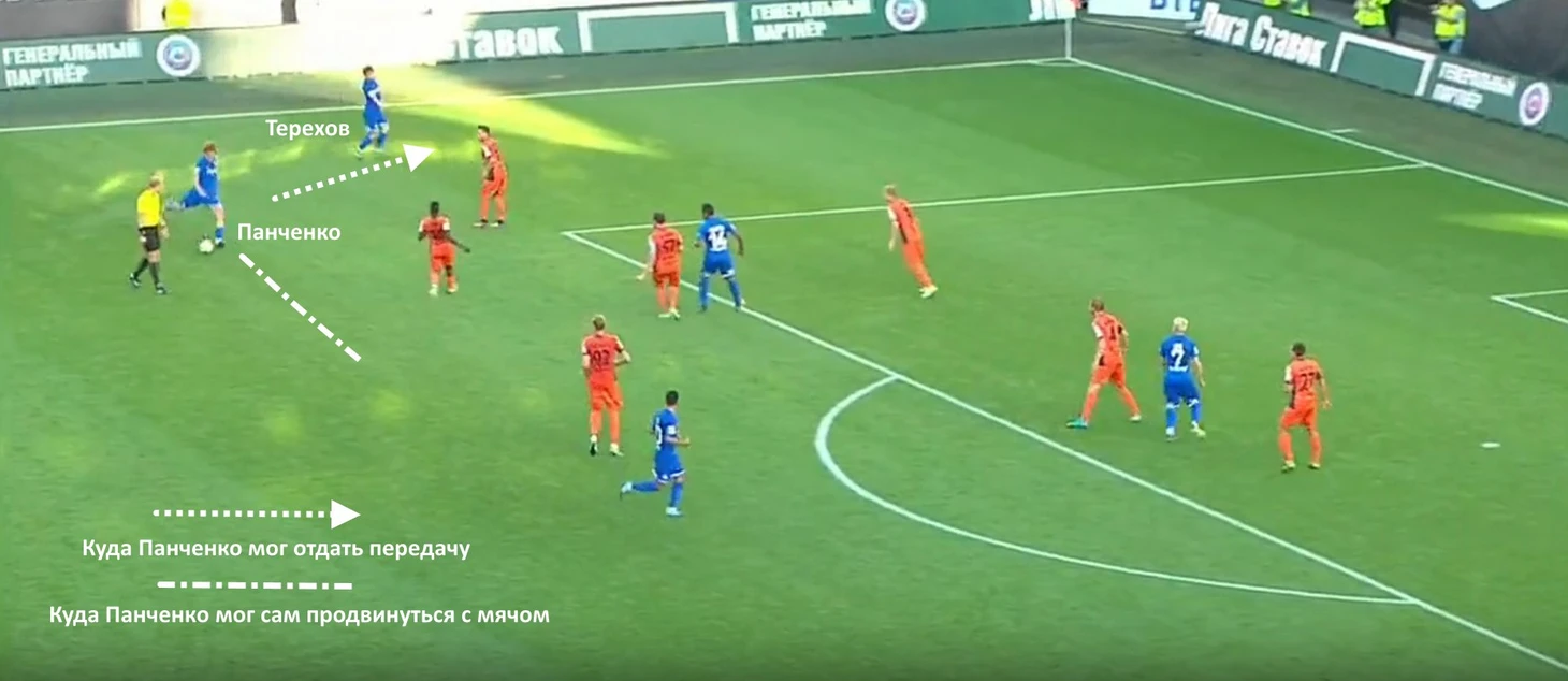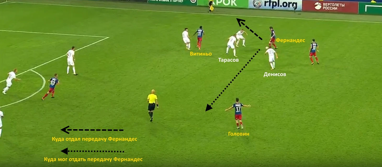 В матче с ЦСКА Денисов и Тарасов нередко вместе шли на мяч, оголяя центр, куда открывались хавбеки армейцев (в основном, Головин). Команда Гончаренко не всегда использовала возможности для вывода полузащитника на удар, но шансы на это были.