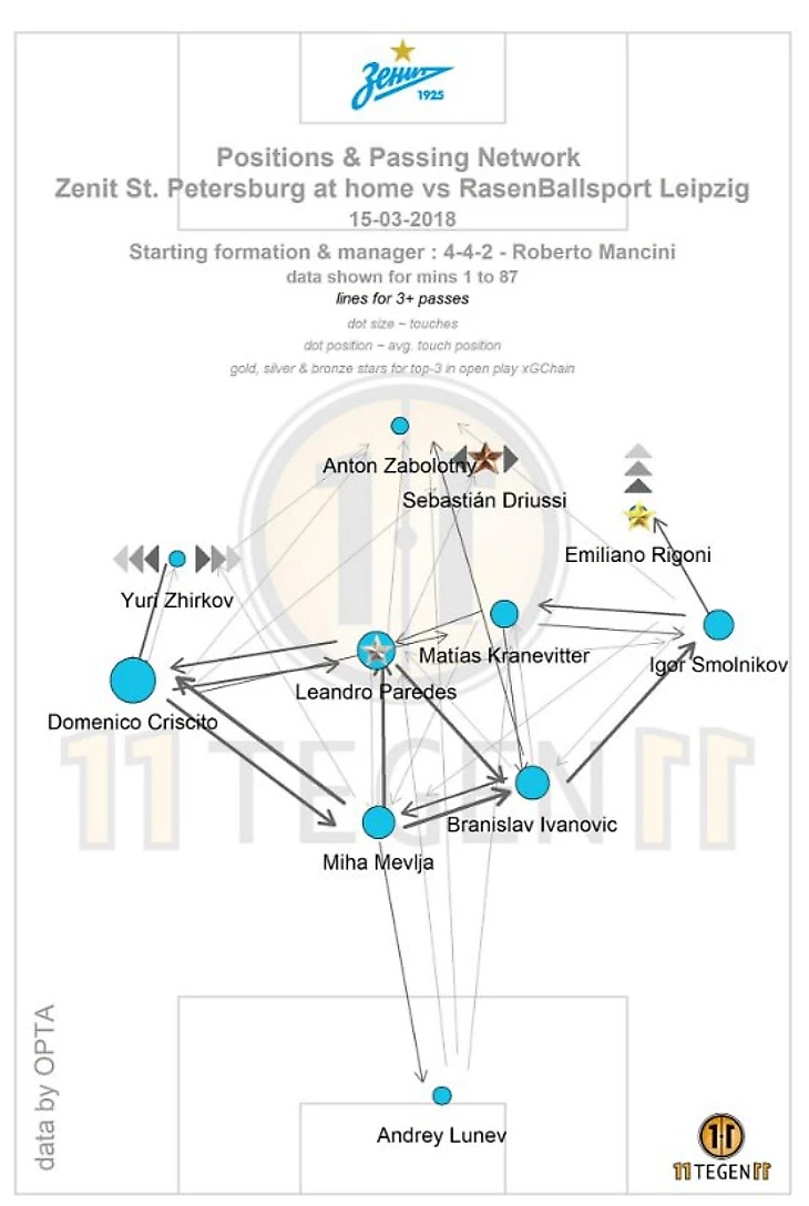Показательна карта передач «Зенита». Иванович сделал 5 передач на Заболотного, Кришито и Смольников – по 4, Жирков, Лунев и Паредес – по 3. Это не самые популярные комбинации у команды Манчини (Мевля на Кришито – 9 пасов) в целом, но наиболее распространенные в атаке.