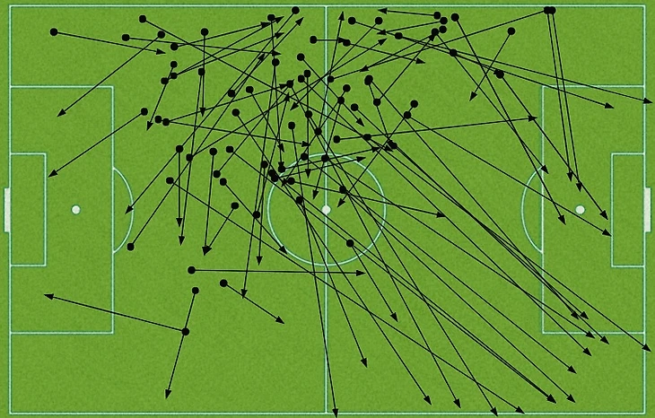 Вот, например, карта передач Магнуссона в августовской игре с «Ростовом». Предугадать направление паса исландца в атаку было практически невозможно.