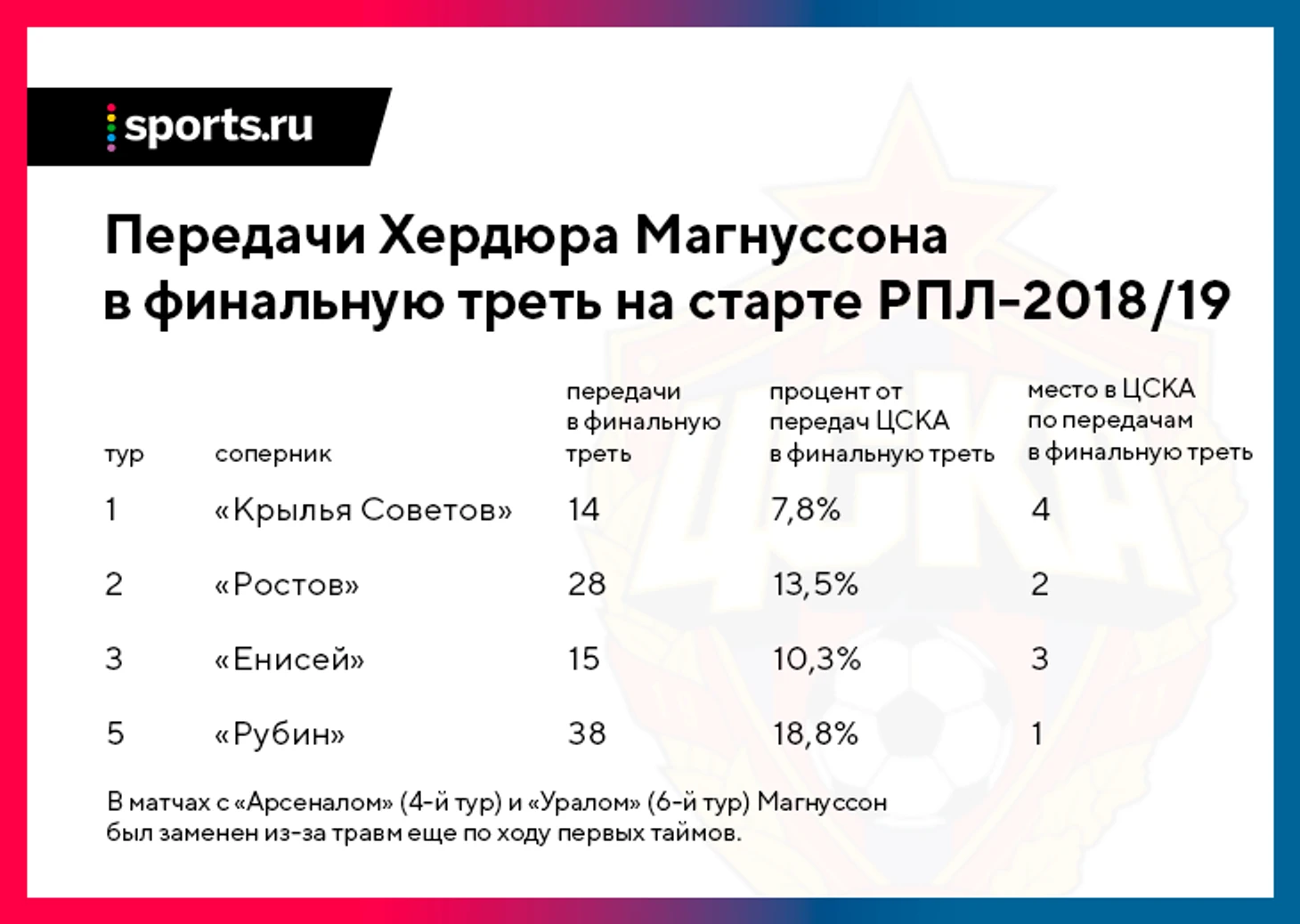 Чаще всего ЦСКА продвигался в финальную треть поля и чужую штрафную через Магнуссона. Исландец двигался с мячом к центральному кругу и заряжал диагональ на Фернандеса. Это работало: русский бразилец либо классно обрабатывал мяч грудью, либо выигрывал верховую борьбу (после 17 туров у Марио 70,4% выигранных единоборств за 90 минут, в среднем за матч – 4,4).