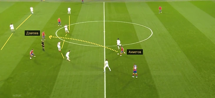 Пасовая статистика Ахметова прекрасна. Он лучший игрок ЦСКА по передачам за 90 минут, по пасам вразрез (6-е место в лиге), второй – по progressive passes (продвижение мяча на определенную дистанцию), количеству отрезанных передачами соперников и отрезанных защитников.