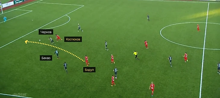 3) Сразу после перерыва оставил весь левый фланг Бистровичу (с него Кристиян забил в конце матча) и перешел на 3-4-3 с Чаловым (левее), Жамалетдиновым (правее) и Абелем (в центре) в атаке;
