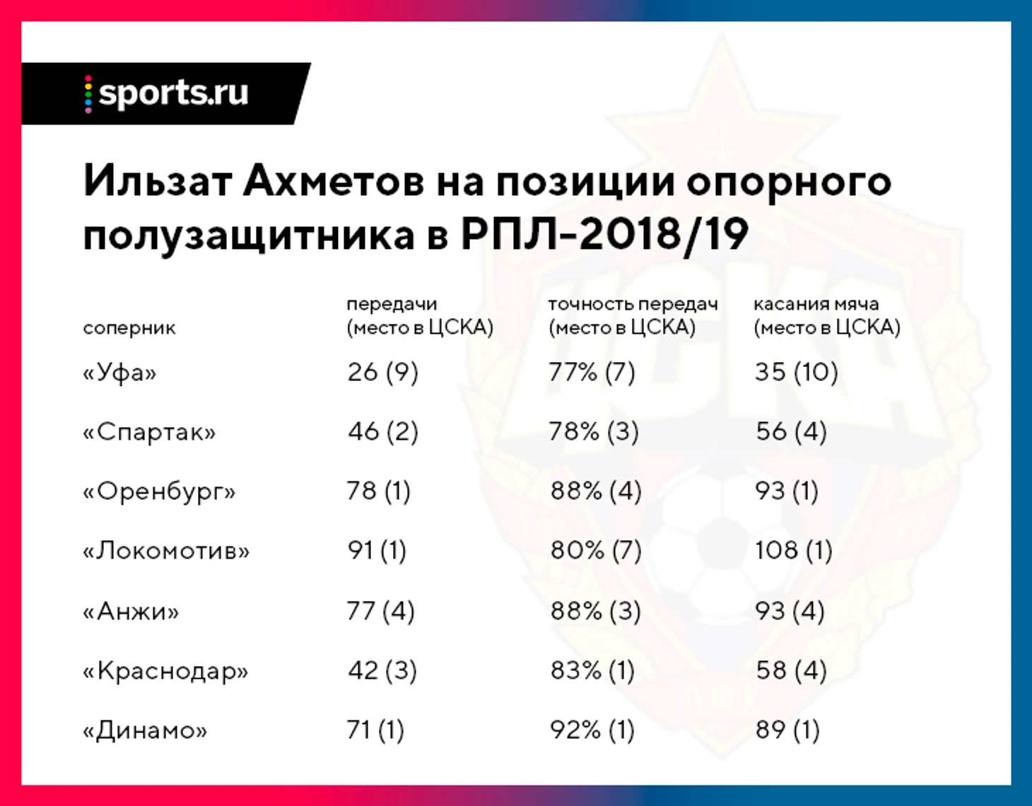 Матчи со «Спартаком», «Оренбургом» и «Локомотивом» ЦСКА провел без Магнуссона, но цифры Ахметова не упали даже после возвращения Хердюра. Относительно слабые показатели в игре с «Краснодаром» – следствие стиля соперника (и то ЦСКА немного больше владел мячом до 60-й минуты), а не индивидуального провала Ильзата.