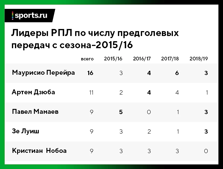 Перейра – однозначный лидер лиги по предголевым пасам начиная с сезона-2015/16 (статистика считается только с этого времени).