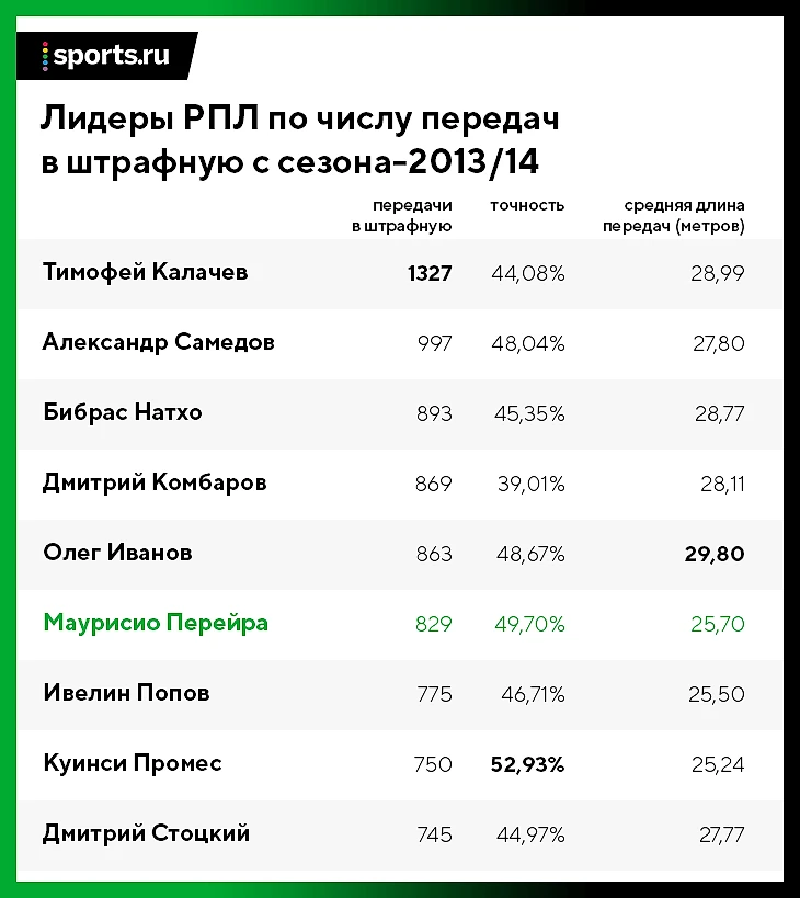 По количеству передач в штрафную с сезона-2013/14 (первый его полный сезон в РПЛ) Перейра входит в топ-10.